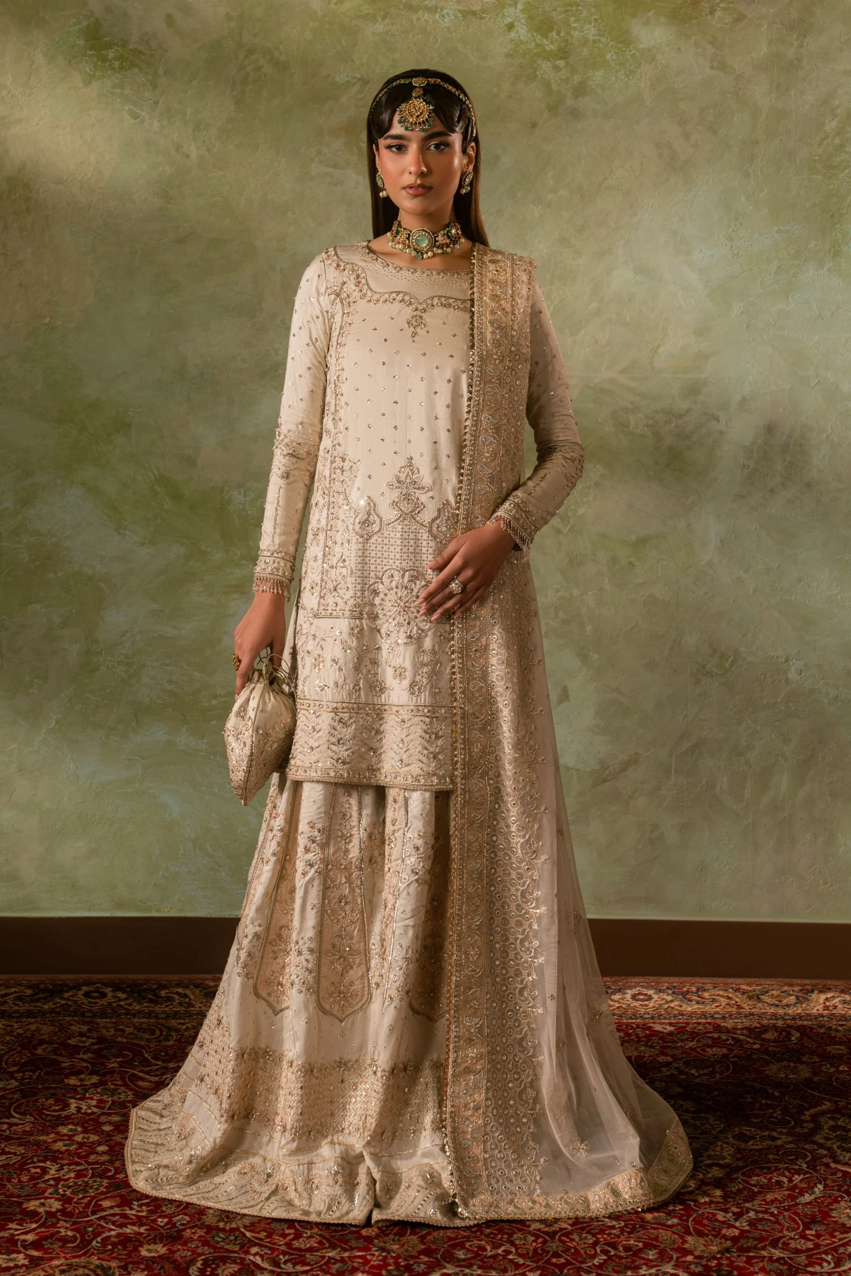 Pair the Damiya with pearl or kundan jewellery to complement the off-white palette beautifully. Opt for nude or champagne heels and a soft, dewy makeup look for a bridal appearance that feels elegant and fresh. This ensemble also works as a sophisticated party wear outfit for formal dinners and walima functions where understated luxury is the goal.