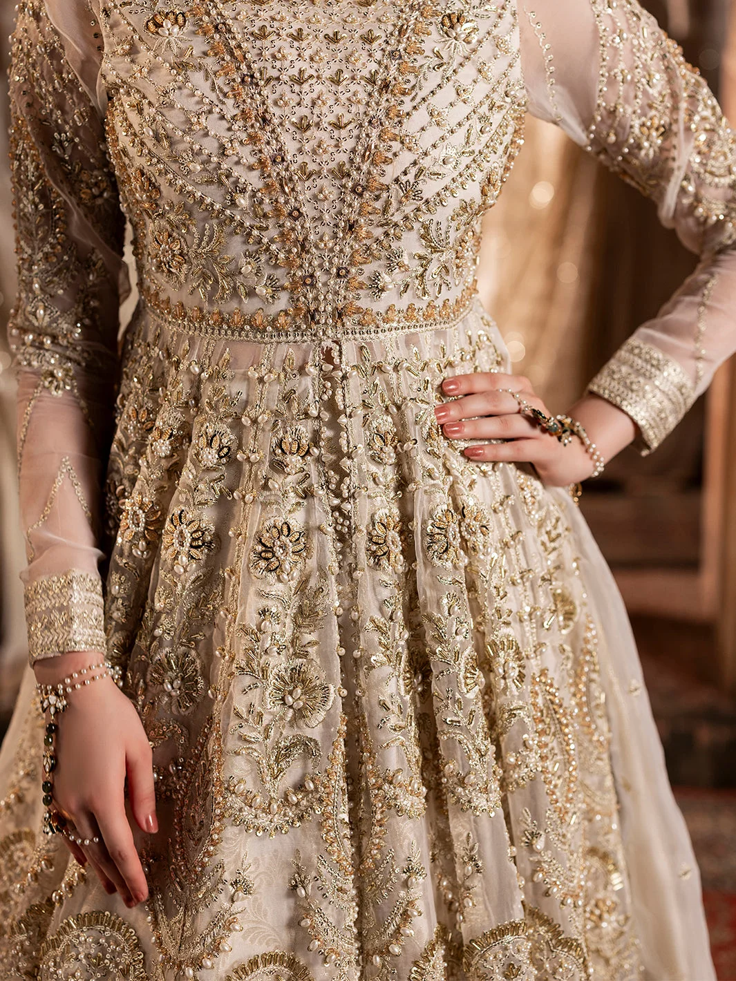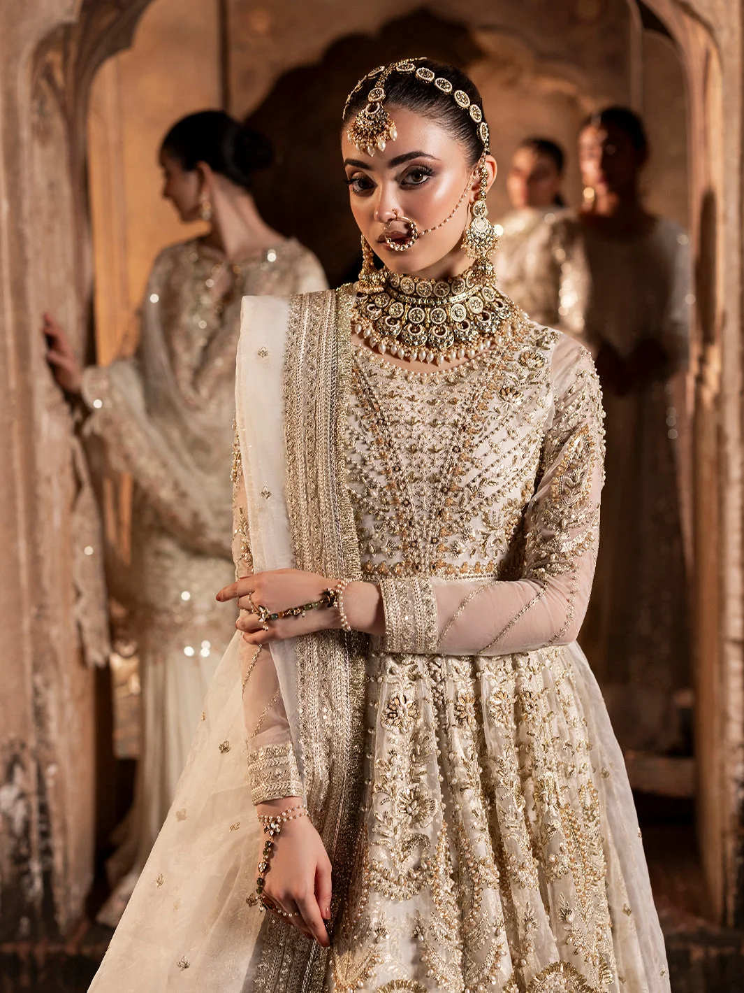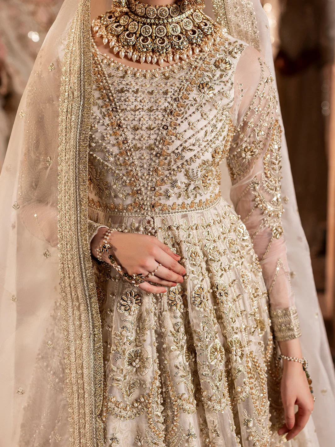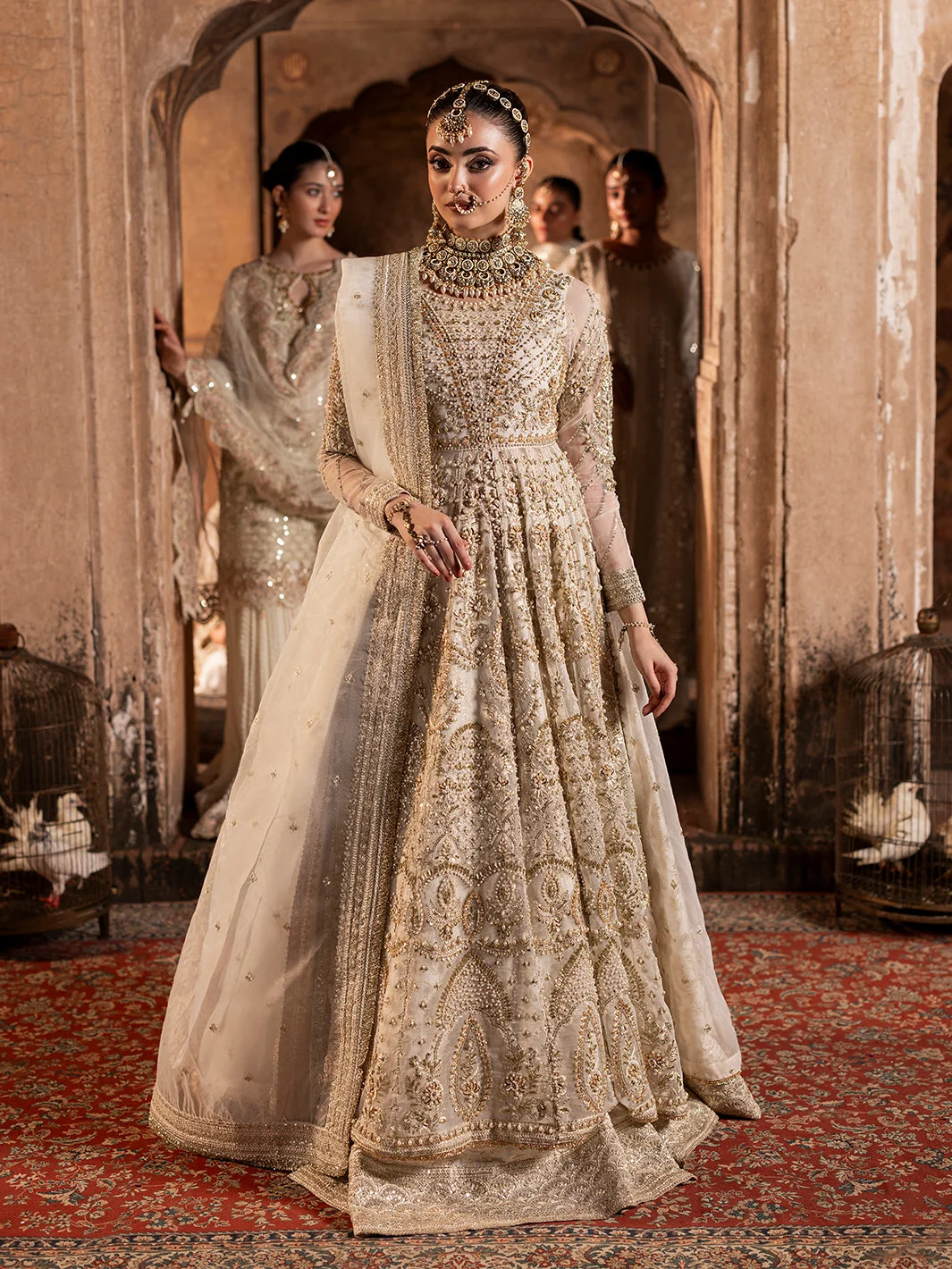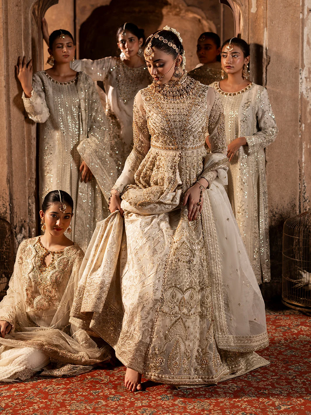 Pair this luxury formal wear ensemble with statement pearl or kundan jewellery to elevate the look for a wedding or valima. Opt for nude or champagne heels to let the gown take centre stage. A sleek updo or soft curls both complement the elegance of this outfit beautifully. Add a clutch in gold or silver to complete your formal look.