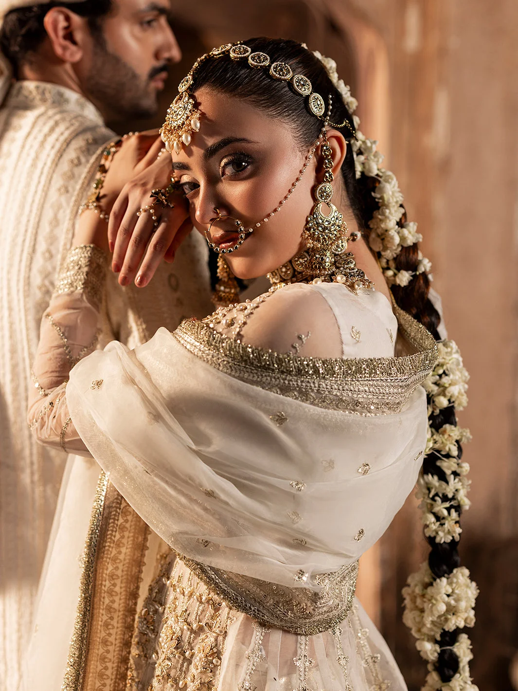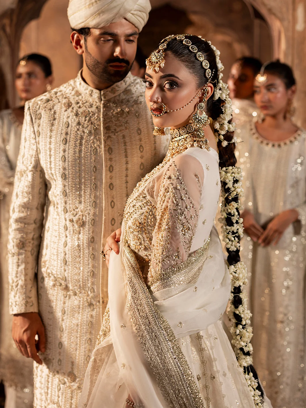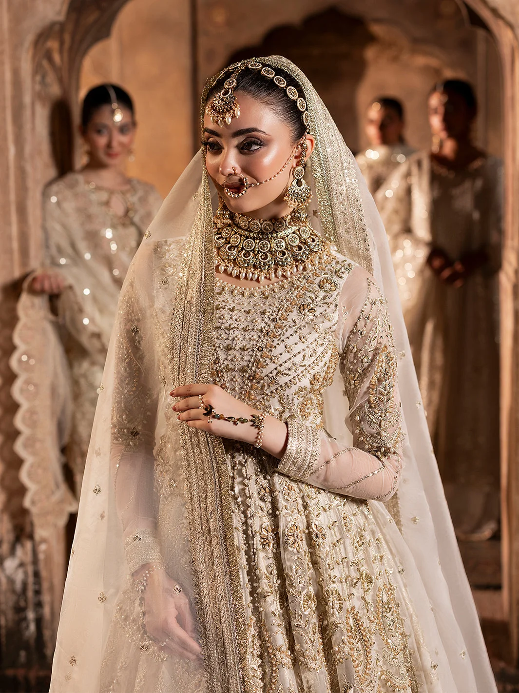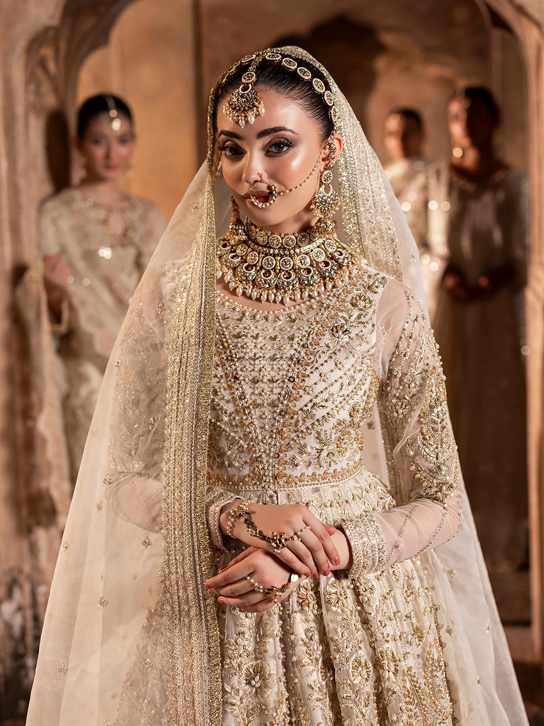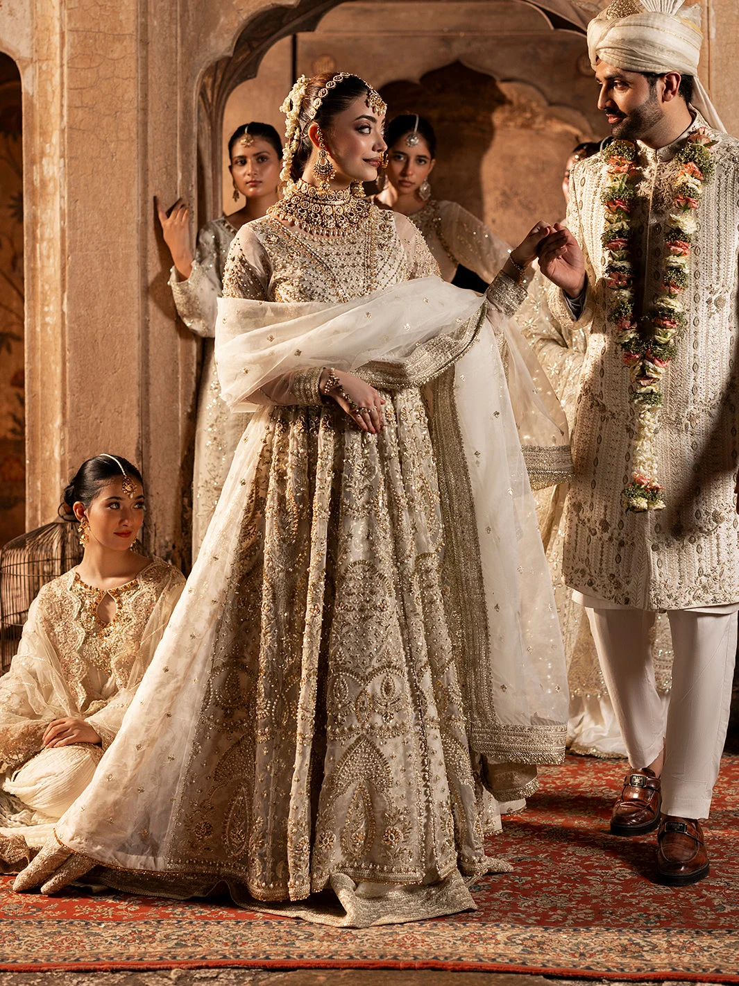 Pair this luxury formal wear ensemble with statement pearl or kundan jewellery to elevate the look for a wedding or valima. Opt for nude or champagne heels to let the gown take centre stage. A sleek updo or soft curls both complement the elegance of this outfit beautifully. Add a clutch in gold or silver to complete your formal look.