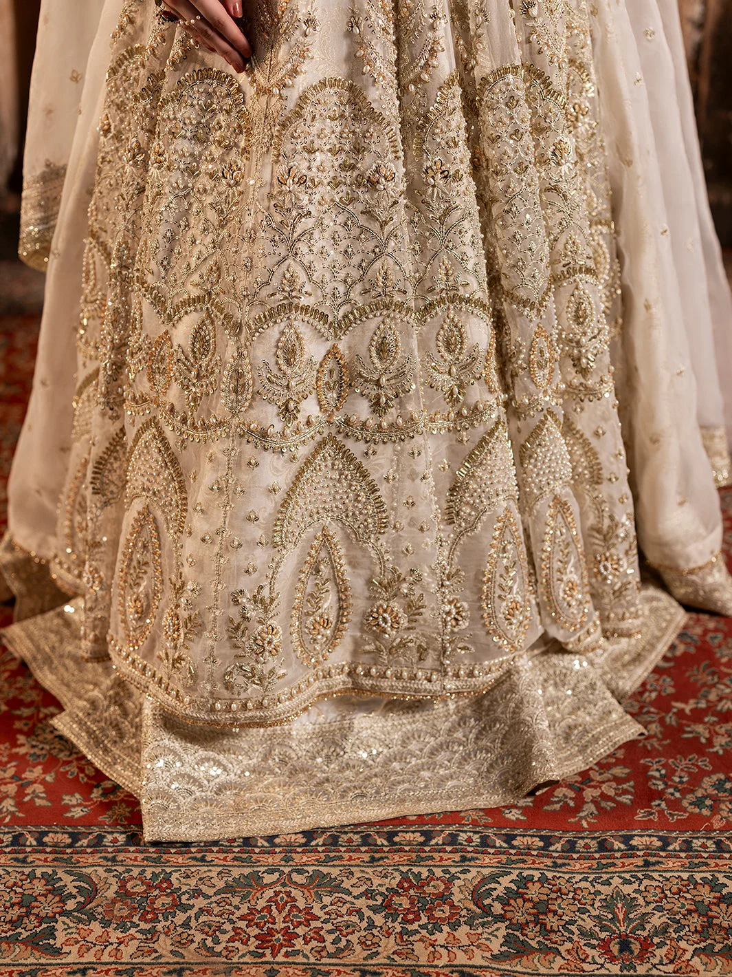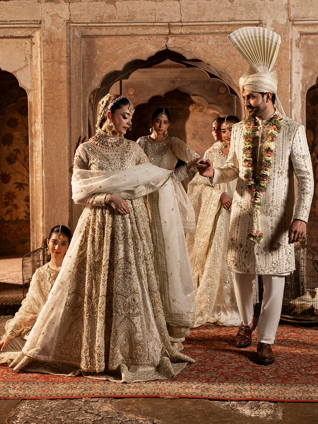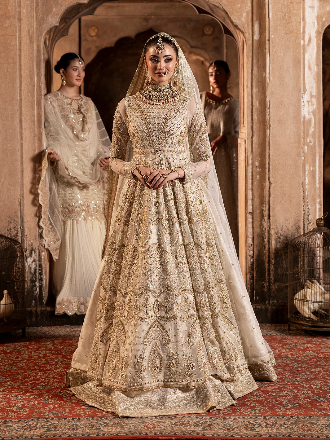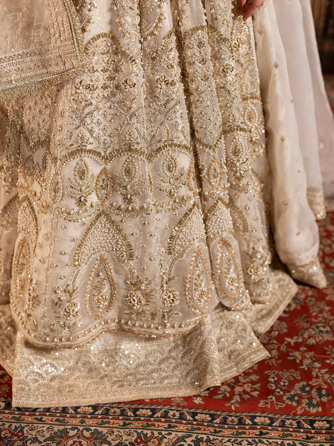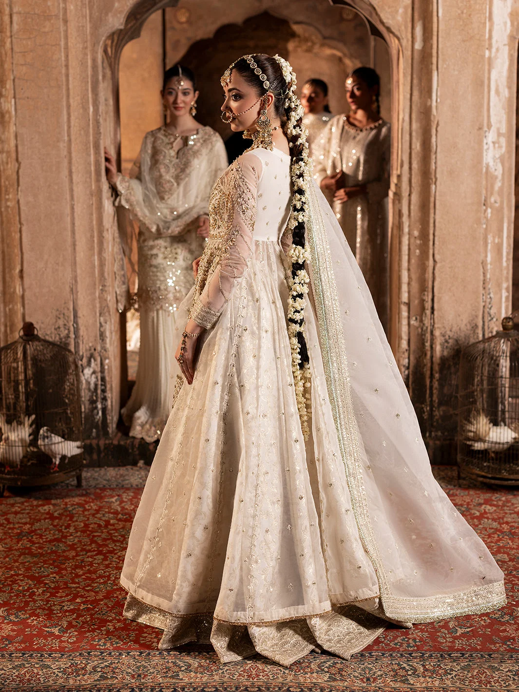 Pair this luxury formal wear ensemble with statement pearl or kundan jewellery to elevate the look for a wedding or valima. Opt for nude or champagne heels to let the gown take centre stage. A sleek updo or soft curls both complement the elegance of this outfit beautifully. Add a clutch in gold or silver to complete your formal look.