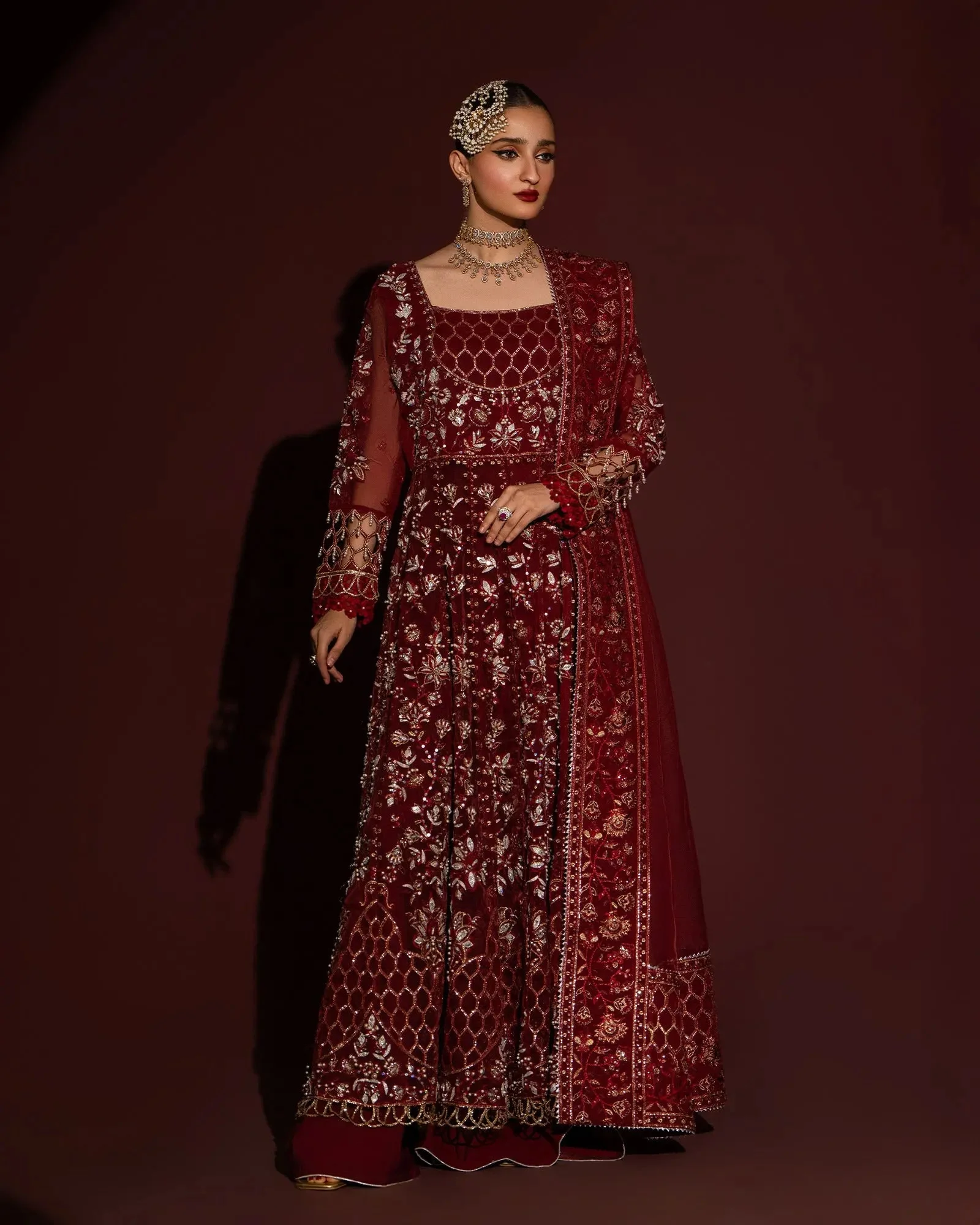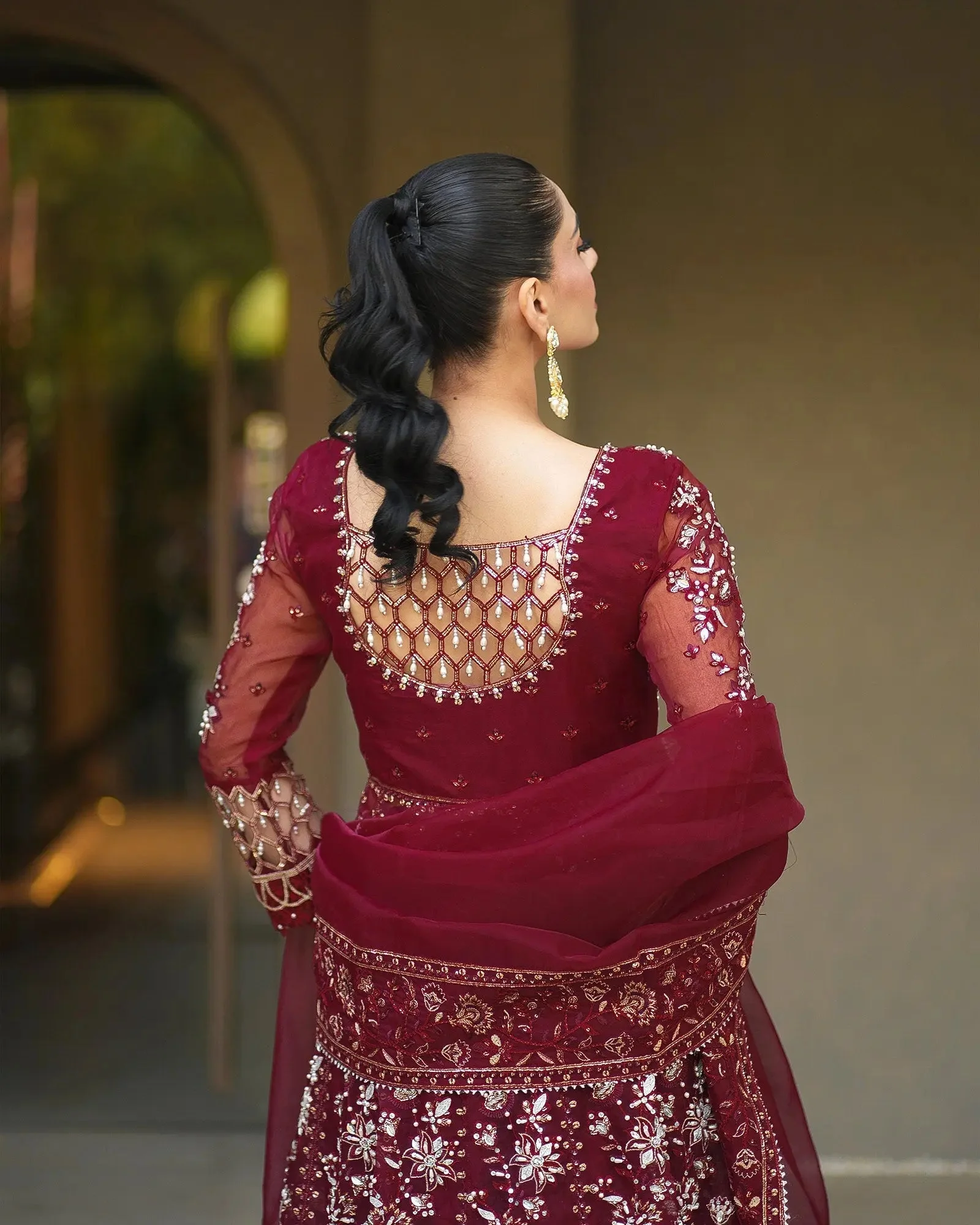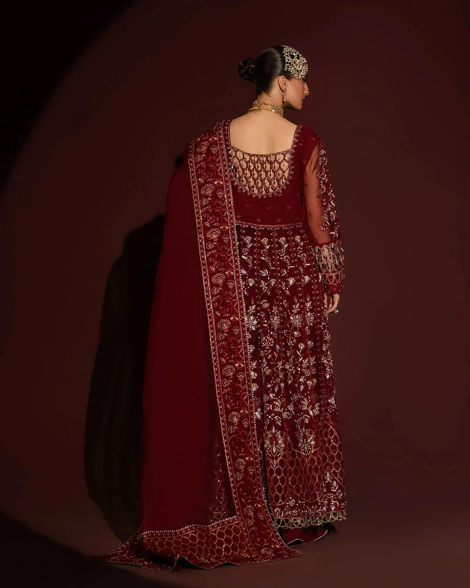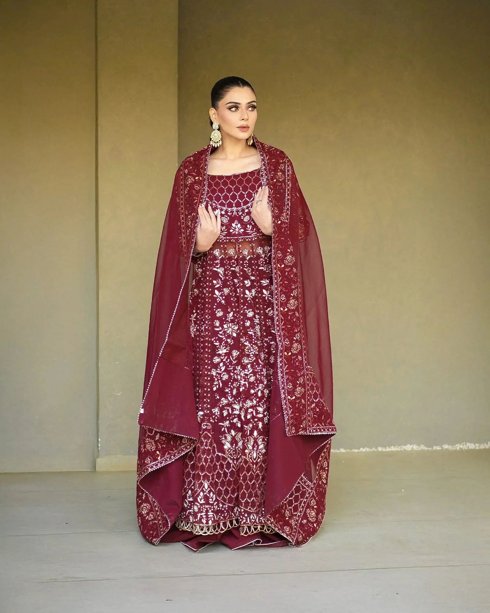 Only the finest materials have been selected to bring this ensemble to life. The maxi and dupatta are crafted from premium organza, known for its delicate sheen and lightweight drape — a fabric beloved in luxury Pakistani formal wear. The palazzo features plain kattan, offering a smooth, structured counterpoint to the flowing organza layers.