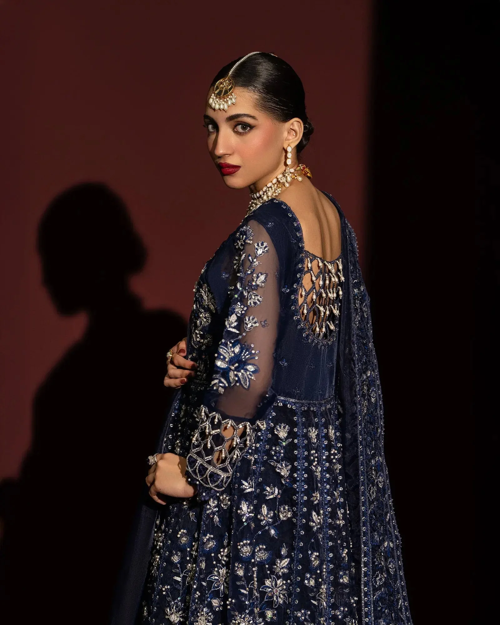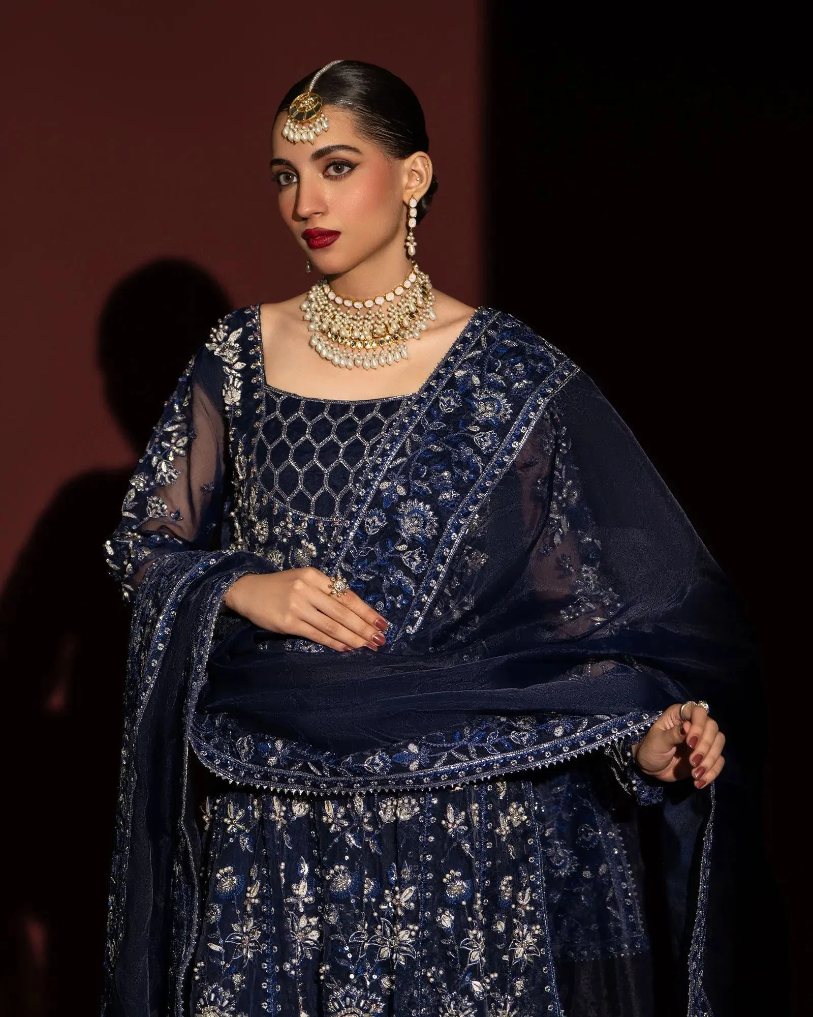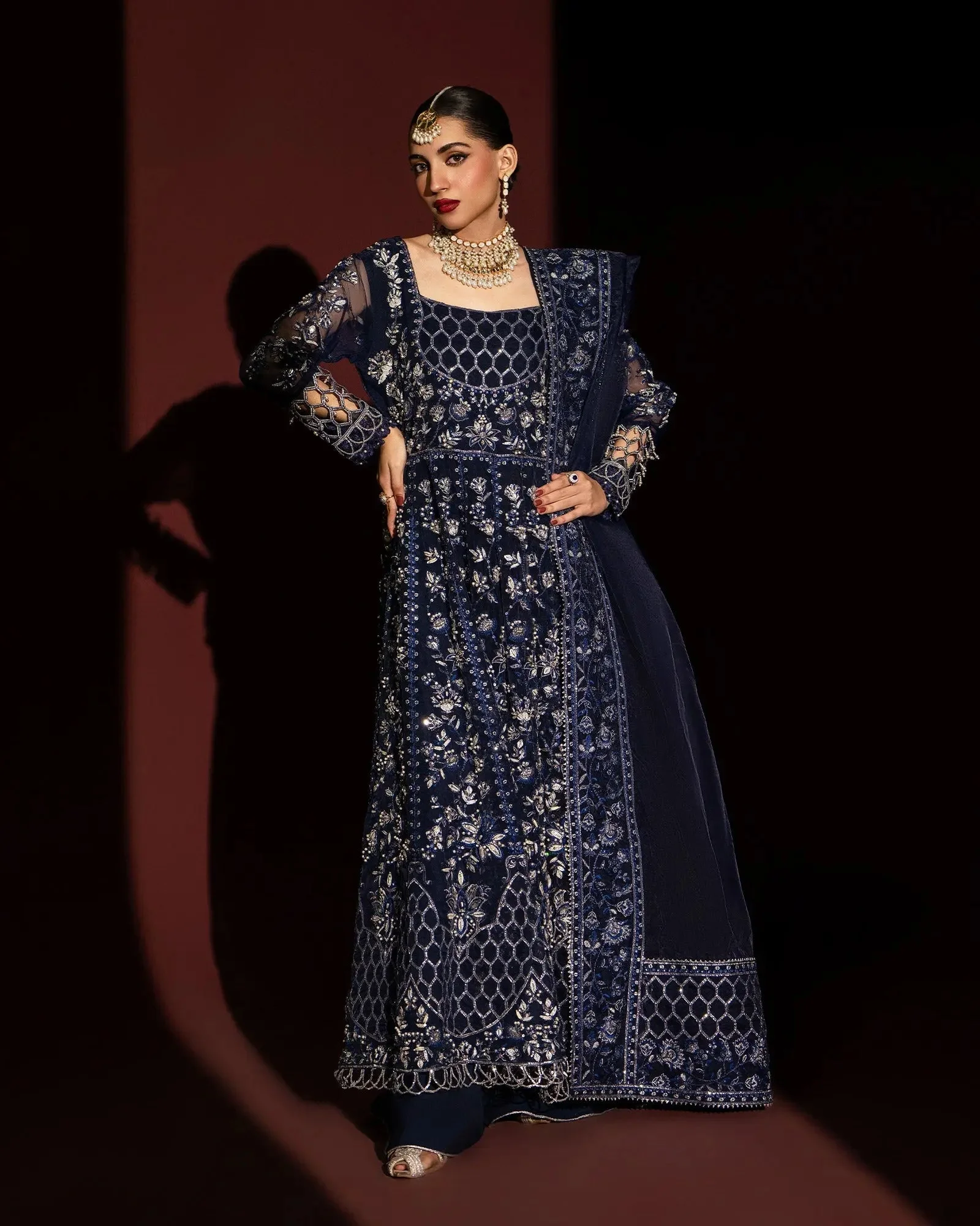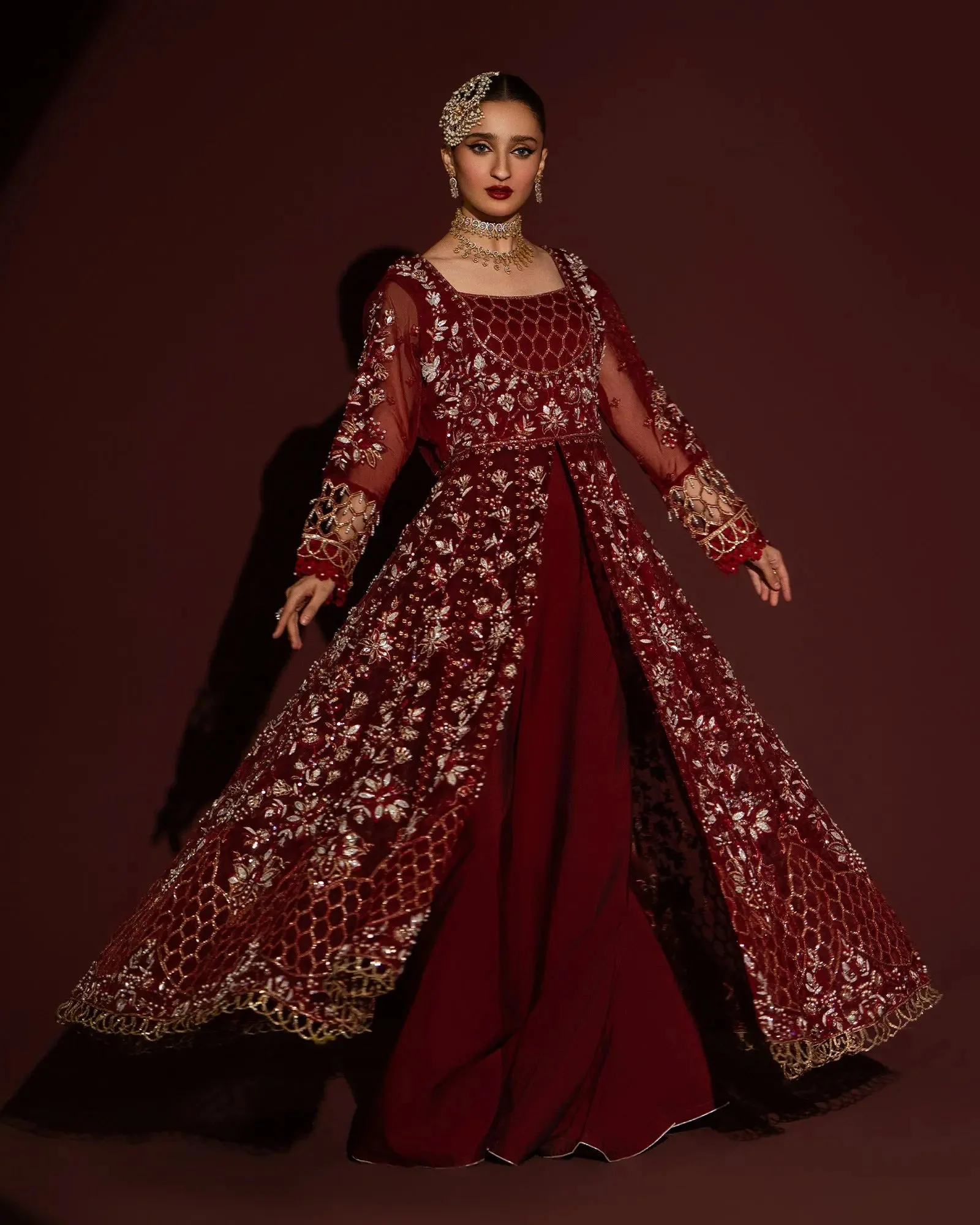 The open-front maxi silhouette is a celebrated style in Pakistani formal fashion, offering a dramatic yet graceful look that suits all body types. The flowing organza fabric catches the light beautifully, while the clean lines of the palazzo trouser add a modern touch. Available in two stunning shades — a deep, passionate Maroon and a sophisticated Blue — this ensemble is a statement in every sense.