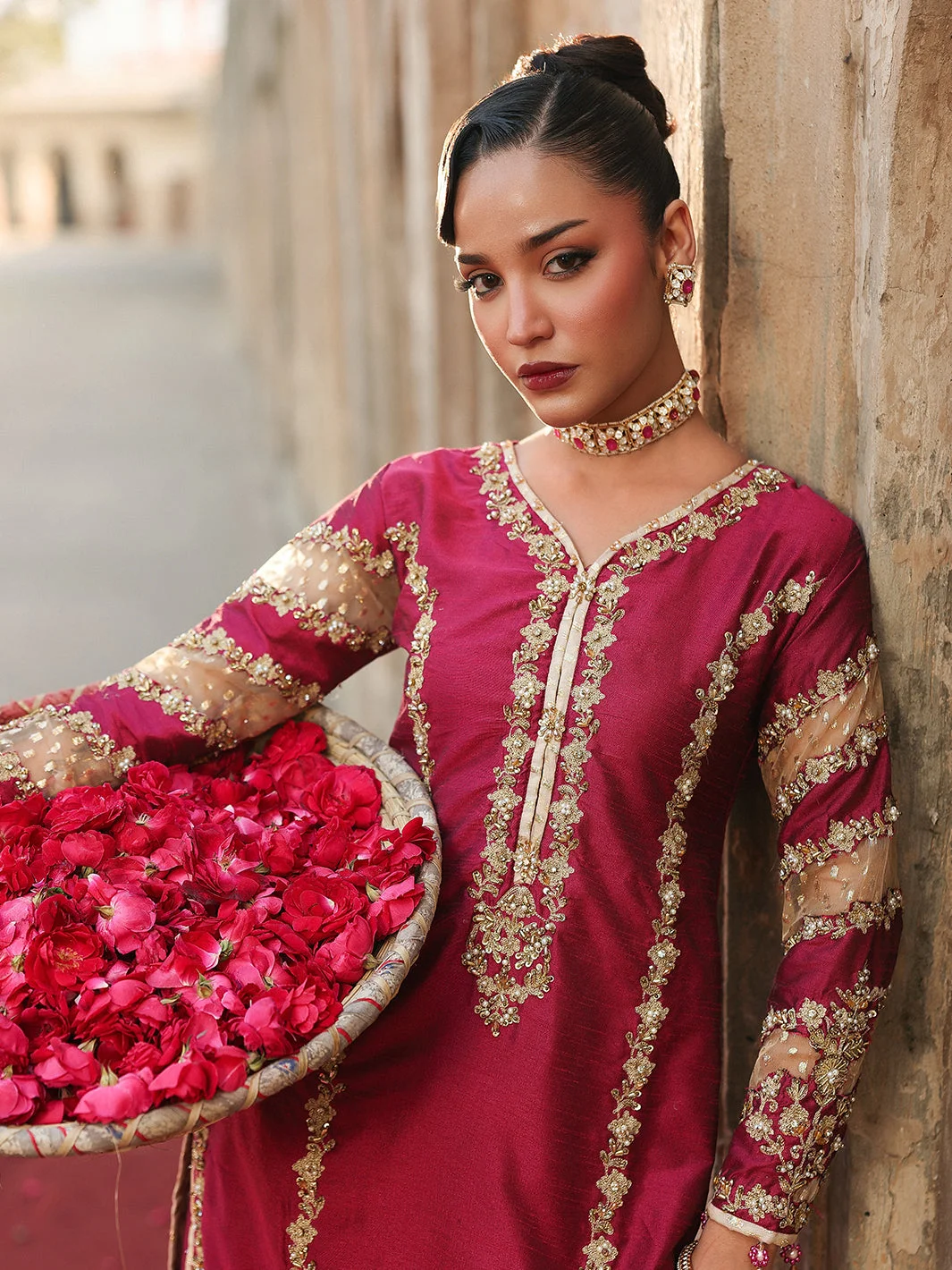 This stunning ensemble is a showcase of traditional Pakistani artistry reimagined with modern sophistication. Every inch of the shirt is adorned with a rich combination of embellishments that make it truly one-of-a-kind: