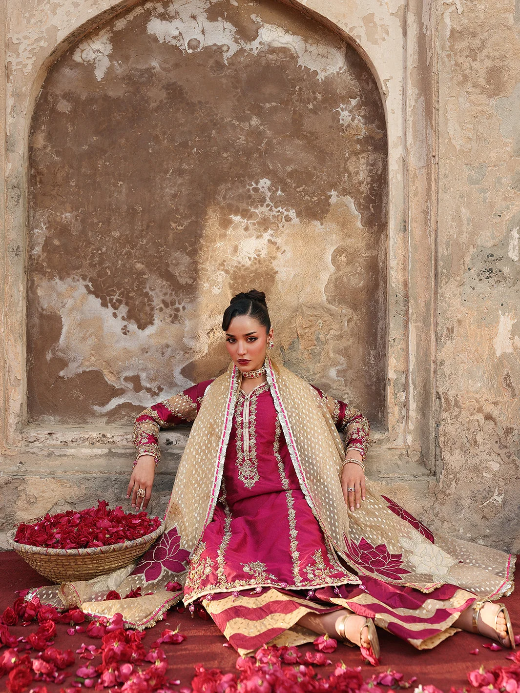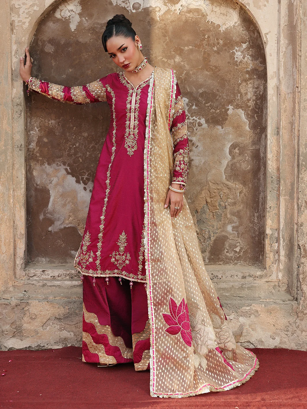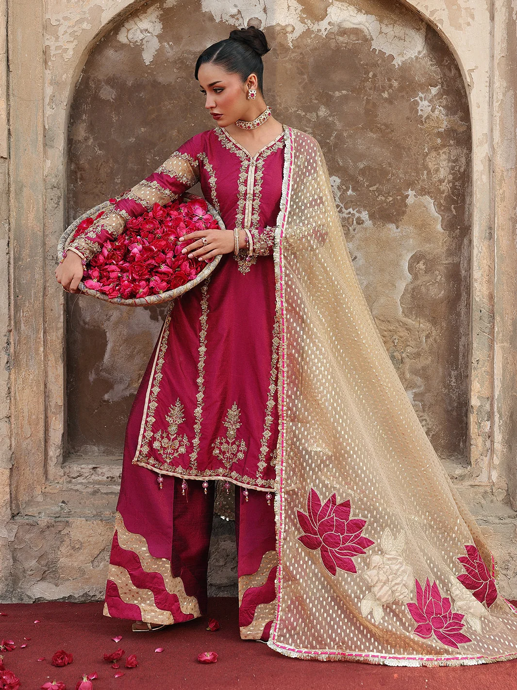 Crafted from premium raw silk, both the shirt and palazzo offer a naturally lustrous finish with a comfortable, breathable drape — ideal for long celebrations. The dupatta is made from organza lurex, complete with an elegant border lace that adds a refined, understated glamour without overpowering the ensemble’s intricate embroidery.