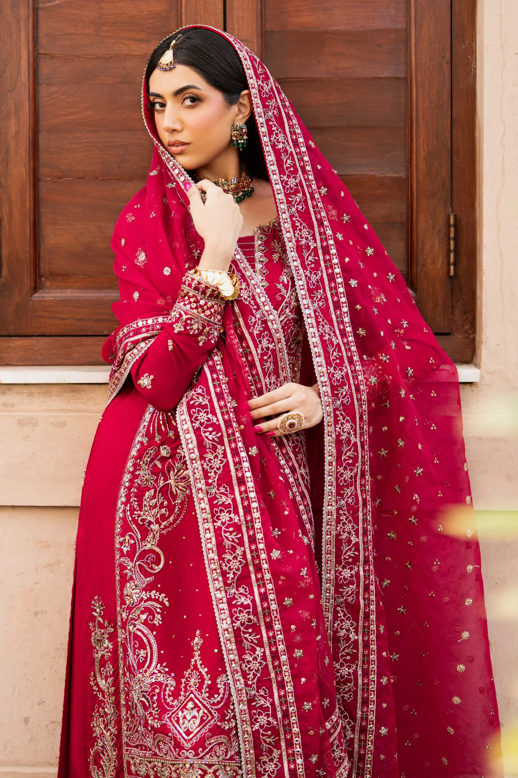 Pair this stunning red ensemble with gold or antique jadau jewellery to complement the intricate embroidery and raw silk texture. Opt for strappy heeled sandals in gold or nude tones to elongate your silhouette. A classic side-parted bun or soft loose curls will let the embellished neckline remain the focal point of your look. Keep your makeup warm — think bold red lips or a smoky bronze eye — to match the richness of the fabric.