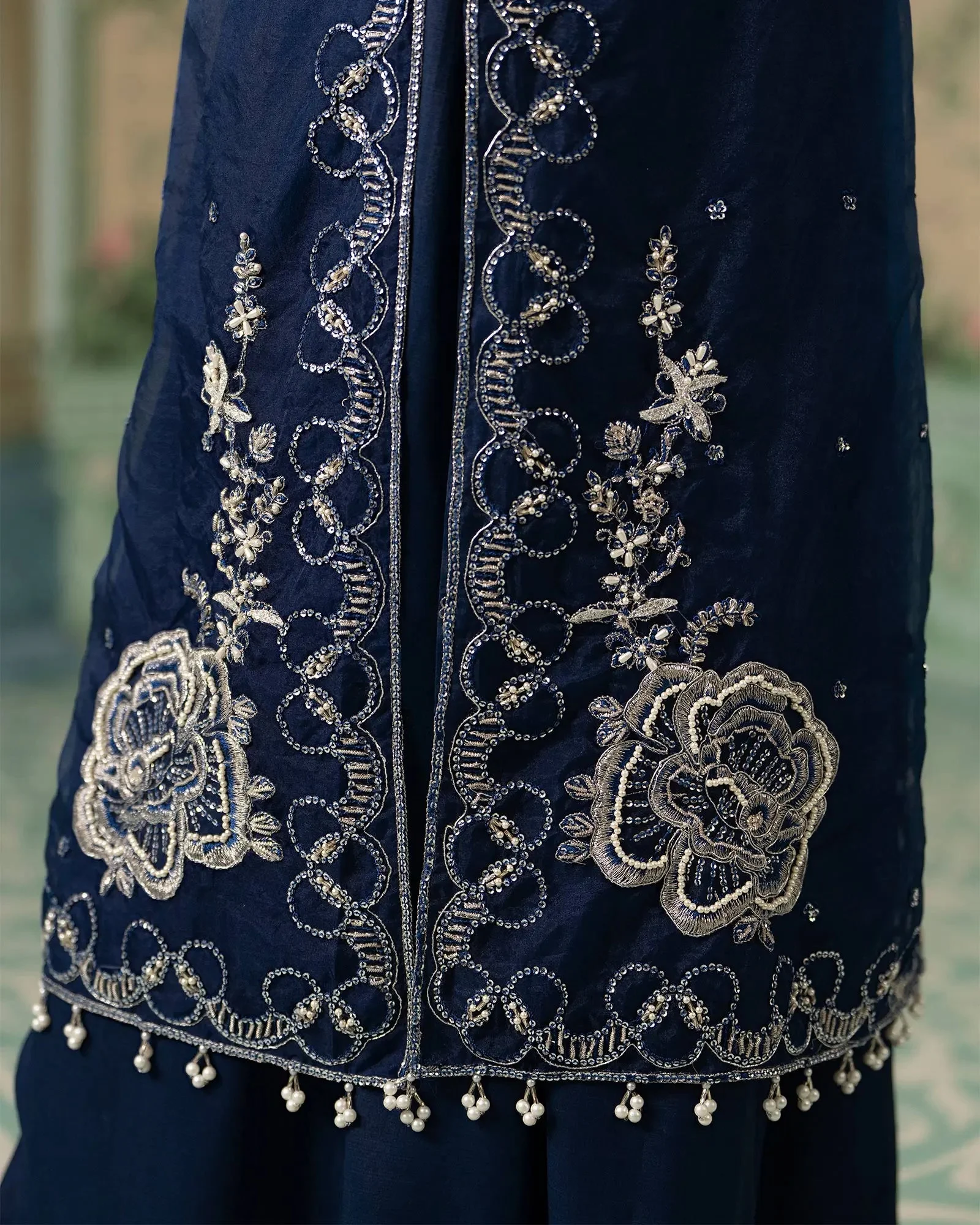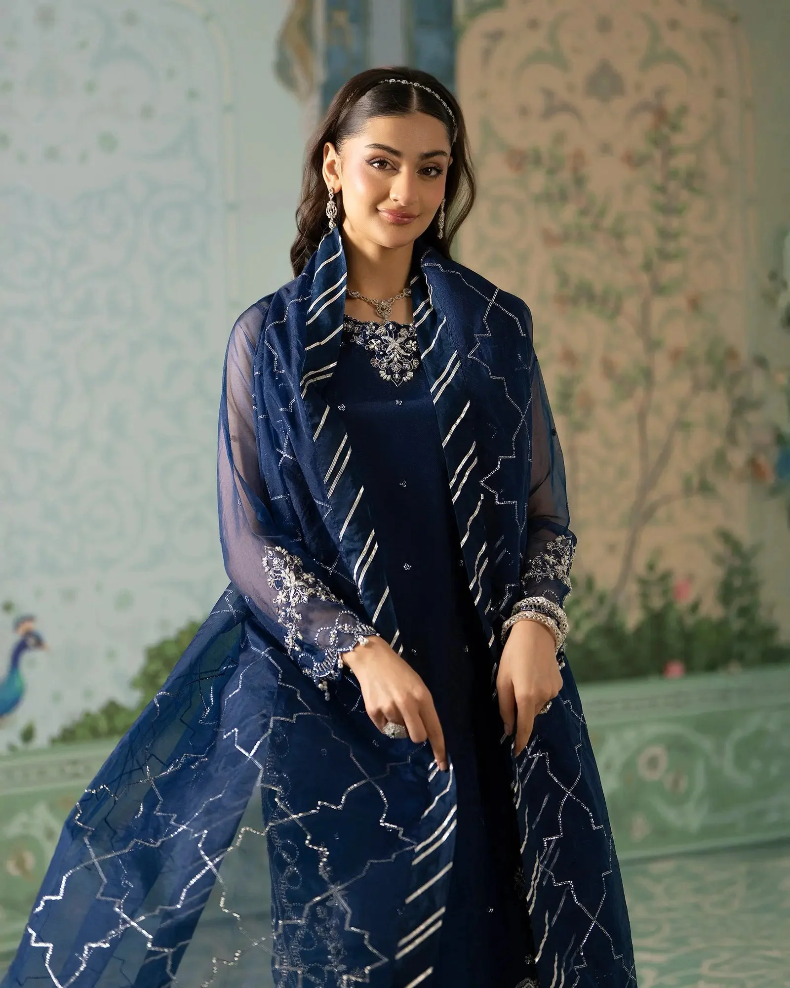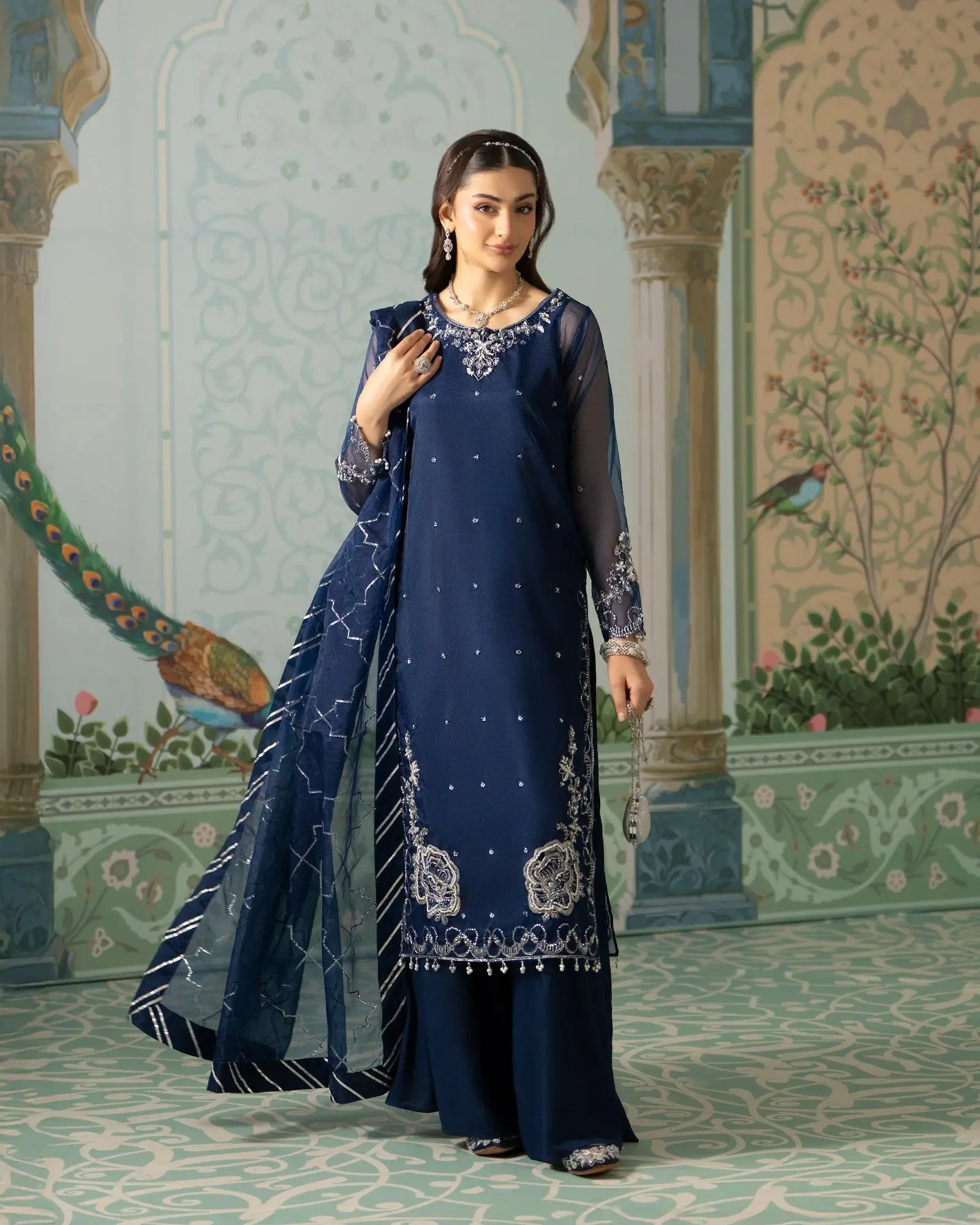 Pair this Zilverah formal wear ensemble with statement jhumkas and a classic clutch for a polished look. Opt for strappy heels in gold or silver to complement the tilla embroidery. A soft, dewy makeup look with a bold lip will elevate the Pink version, while the Blue colorway pairs beautifully with silver accessories and kohl-lined eyes for a dramatic evening look.