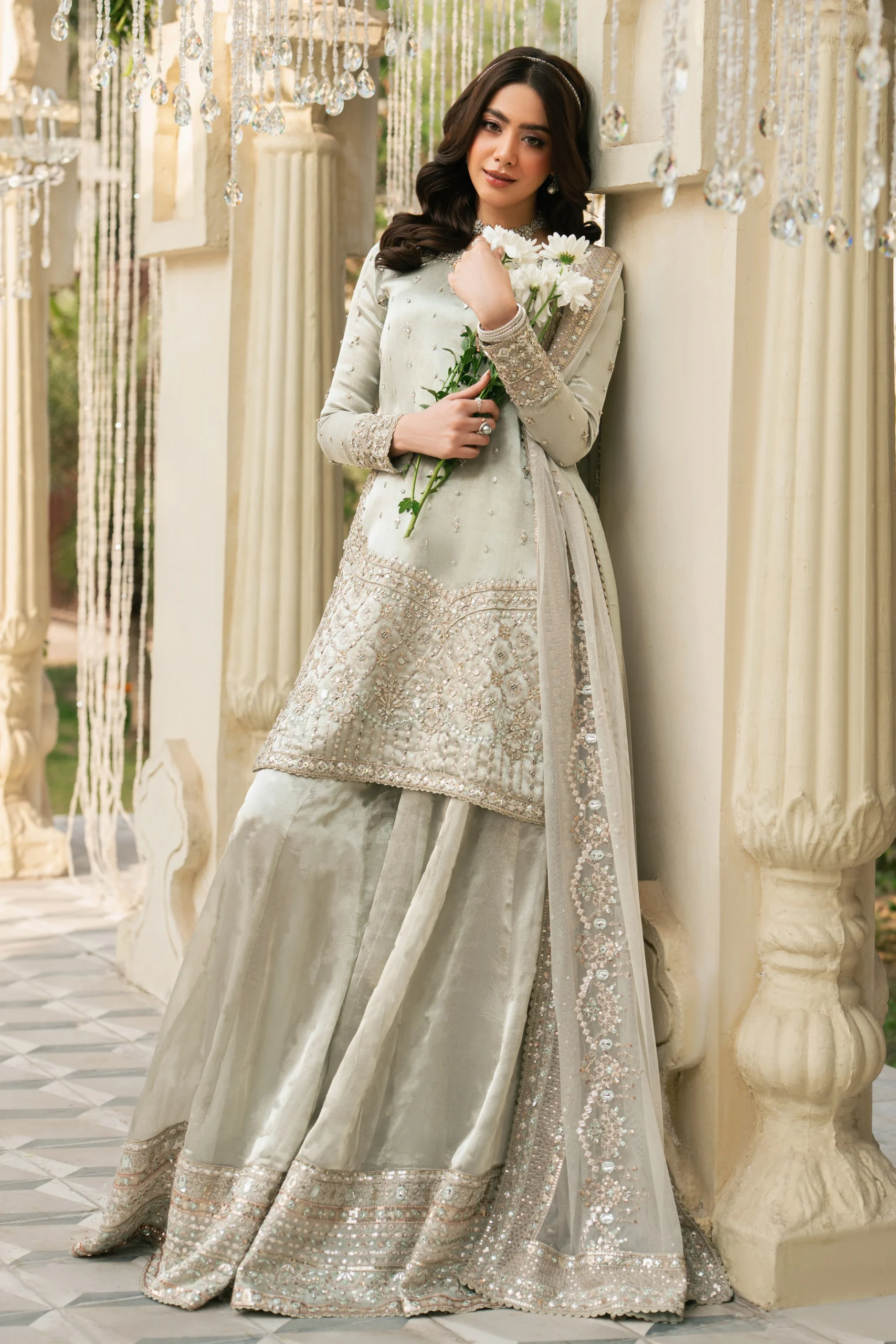 Pair this silver party wear dress with high-heeled silver or gold sandals to elongate your silhouette. Opt for statement earrings and a delicate maang tikka to complete a classic Pakistani bridal guest look. A subtle smoky eye and bold lip will complement the shimmering fabric beautifully. Keep accessories minimal to let the intricate embellishments of the shirt take centre stage.