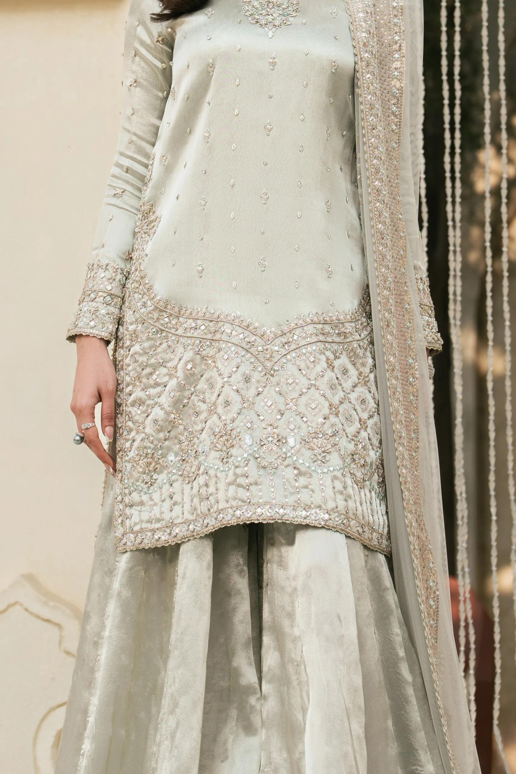 This exquisite outfit features a richly embellished tissue shirt adorned with delicate embroidery and fine embellishments that catch the light beautifully. The silver tone radiates sophistication and pairs seamlessly with statement jewellery for a complete bridal-adjacent look. The flowing net dupatta adds a layer of graceful drama, while the tailored trouser ensures a polished, streamlined silhouette from every angle.