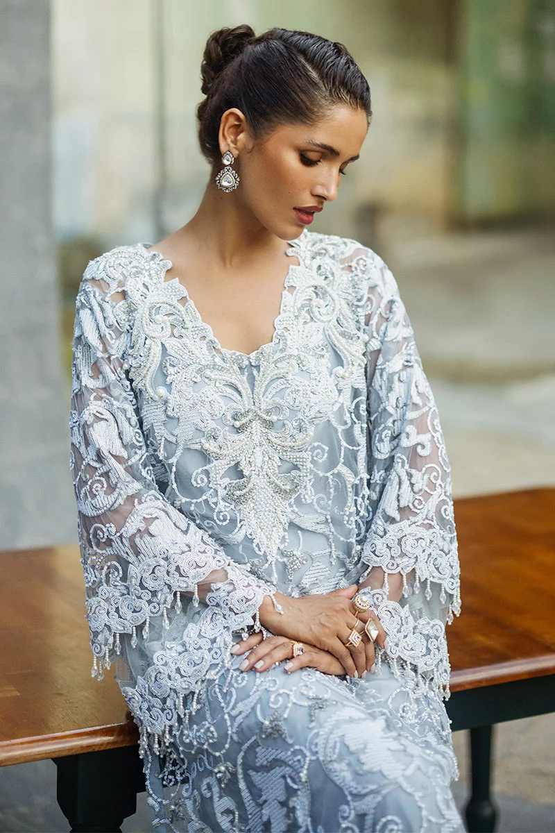 Every stitch of this ensemble tells a story of artisanal excellence. The centrepiece is a meticulously embroidered net shirt adorned with intricate embellishments that catch the light beautifully, creating a luminous, ethereal silhouette. The steel grey tone exudes understated glamour — bold enough to command attention, refined enough to radiate grace.
