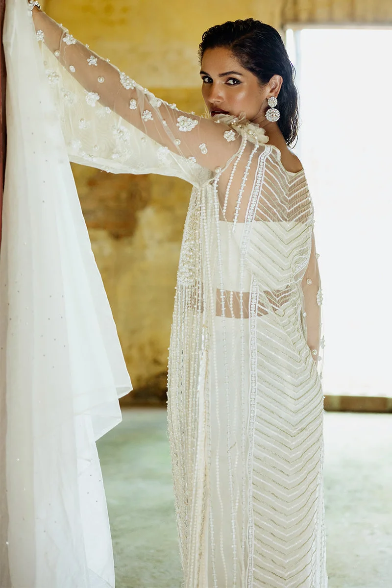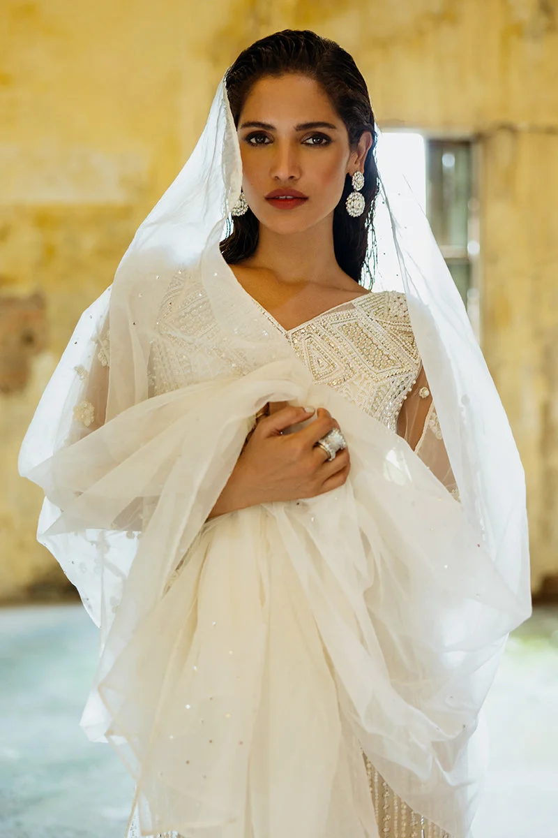 Pair this all-white ensemble with silver or pearl jewellery to amplify its pristine elegance. Opt for strappy heels or embellished khussas for an authentic Pakistani aesthetic. A subtle smoky eye and a sleek bun complete the look for high-profile events, while soft curls and nude lips work beautifully for daytime festivities.